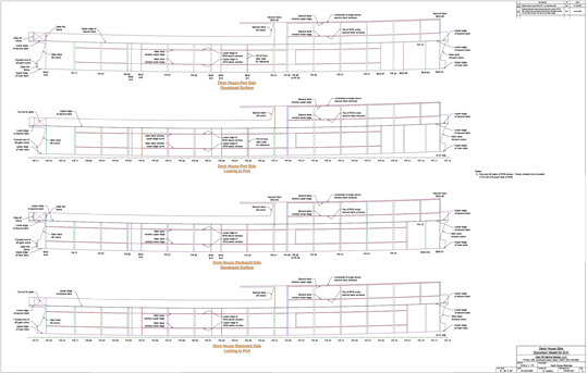 The profile and expanded views of the deck house sides, with all framing and windows located. The profiles were used in construction drawings and the expanded surfaces detailed for CNC cutting.