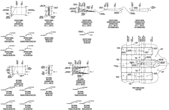 These are the exported shapes for plates in the prop tunnels. Frame locations, stiffener CLs, and bend CLs were included for Bay Marine’s use as fabrication references. These plate shapes were detailed for CNC cutting by Bay Marine. Note the plate bending jig sections included in this drawing, also exported from the computer model.